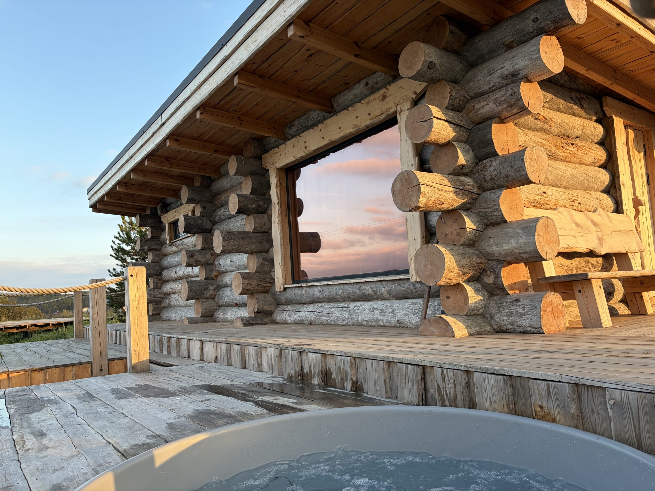 - На террасе у бани есть купель с аэромассажем: расслабляющее плавание под мягкими пузырьками с видом на озеро